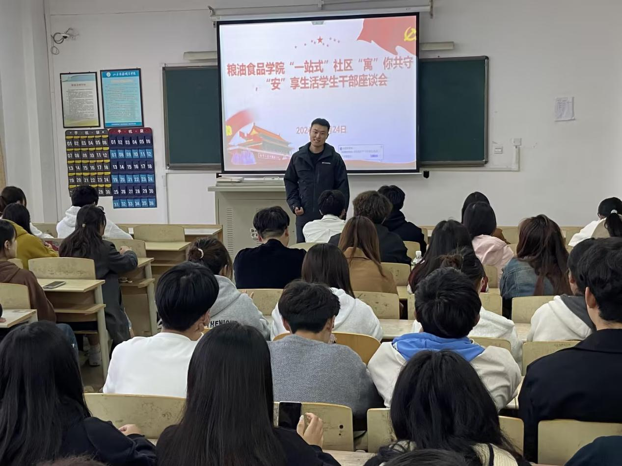 The College of Grain and Oil Holds Symposium for Student Cadres on "One-Stop" Community: "Guard with You, Enjoy Life Safely".... COLUMN:[Teacher&student activities] DATE:2024-11-26 To further enhance the exemplary role of student leaders in community life and strengthen the safety management of the "One-Stop" community, the College of Grain, Oil and Food has held a symposium for student cadres on "One-Stop" Community: "Guard with You, Enjoy Life Safely".During the symposium, the dormitory counselor emphasized that student leaders, as role models among the student body, ... ...