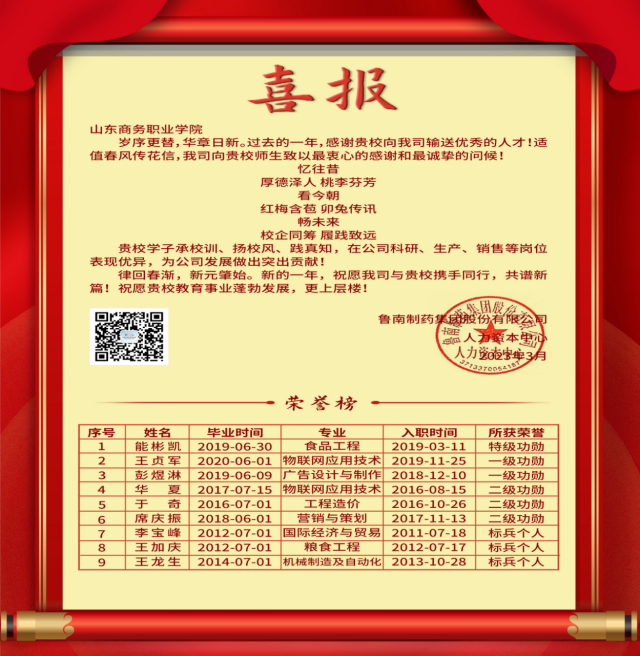 27 Graduates from Our School Received Awards from Lunan Pharmaceutical Group.... COLUMN:[News] DATE:2023-03-23 Recently, our school received a good news from Lunan Pharmaceutical Group. 27 graduates were awarded by Lunan Pharmaceutical Group for their outstanding contribution to the development of the company in scientific research, production and sales. Among them, the graduate Neng Binkai was awarded the Group's "Special Merit" award, two graduates, Peng Yulin and Wang Zhenjun, were awarded the Group'... ...
