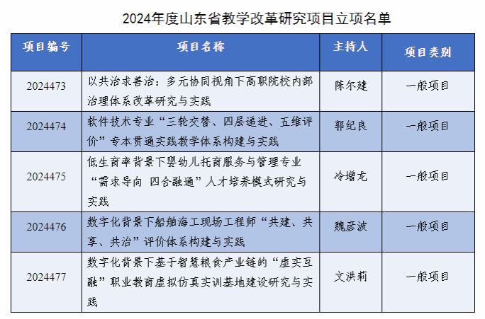 Our University Secures Approval for 5 Provincial-Level Teaching Reform Research Projects.... COLUMN:[Events] DATE:2025-03-27 Recently, the Shandong Provincial Department of Education issued the "Notice on the Approval of 2024 Shandong Vocational Education Teaching Reform Research Projects" (LuJiaoZhiHan [2025] No. 6), in which five teaching reform research projects from our university were successfully approved. This achievement highlights our university’s significant progress in vocational education innovation and reflects ... ...