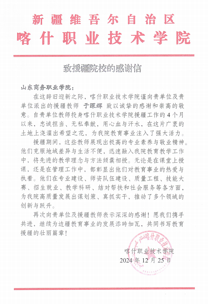 Our School's Aid Teachers Successfully Completed their Mission and Returned with Honors.... COLUMN:[Events] DATE:2025-01-23 Recently, Xinjiang Kashgar Vocational and Technical College sent a thank-you letter, expressing sincere gratitude to our school and our aid teacher, Yu Shenhui. Teacher Yu Shenhui carried out a four-month aid mission in Kashgar Vocational and Technical College, injecting new vitality into the local education sector with his loyalty, dedication, and selfless spirit, and furthering innovation and development ... ...