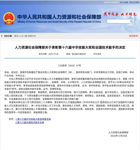 Our Teacher Won the 16th National Technical Expert Title.... COLUMN:[Events] DATE:2023-03-03 Recently, the Ministry of Human Resources and Social Security announced the "Decision of the Ministry of Human Resources and Social Security on Honoring the 16th Chinese Skill Award and National Technical Achiever", and the teacher Mrs. Li Haihong was successfully elected as the 16th National Technical Achiever. It is reported that the national technical expert is the highest government award... ...