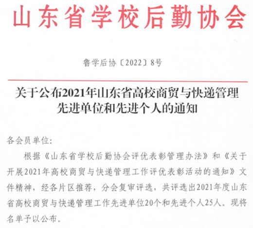 The Logistics Service Department of Our School Won the Advanced Unit of Business and Express Management in Colleges and Universities in Shandong Province.... COLUMN:[News] DATE:2022-05-19 Recently, the logistics service office of our school was rated as the advanced unit of business and express management in Colleges and universities in Shandong Province, and Mr. Cao Zhifei was rated as the advanced individual of business and express management in Colleges and universities in Shandong Province. In recent years, our school have always adhered to the working concept of "studen... ...
