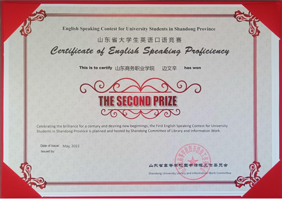 Our Students Won the Understanding Results in the Province's English Oral Speech Competition for College Students.... COLUMN:[Key Research Fields] DATE:2022-07-08 Recently, the English oral speech contest on the theme of "A Century of Brilliance and Youthful Departure" sponsored by Shandong Higher Education Library and Information Work Committee came to a successful end, and our student Bian Wenxin won the second prize after a fierce competition.The competition lasted for 30 days, with a total of 11,780 participants, 300 of whom advanced to the final. O... ...