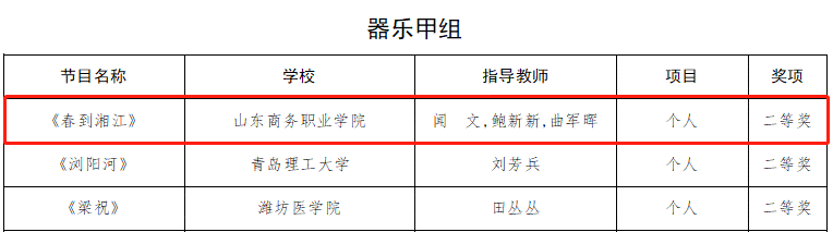 Recently, the list of winners for the 7th Shandong Provincial College Student Art Exhibition was announced. Our school's works won 1 first prize in the Art Practice Workshop, 1 first prize in the Excellent Case of Reform and Innovation in Aesthetic Education in Colleges and Universities, 2 third prizes and 3 second prizes in art works, 1 third prize and 2 second prizes in art performances.