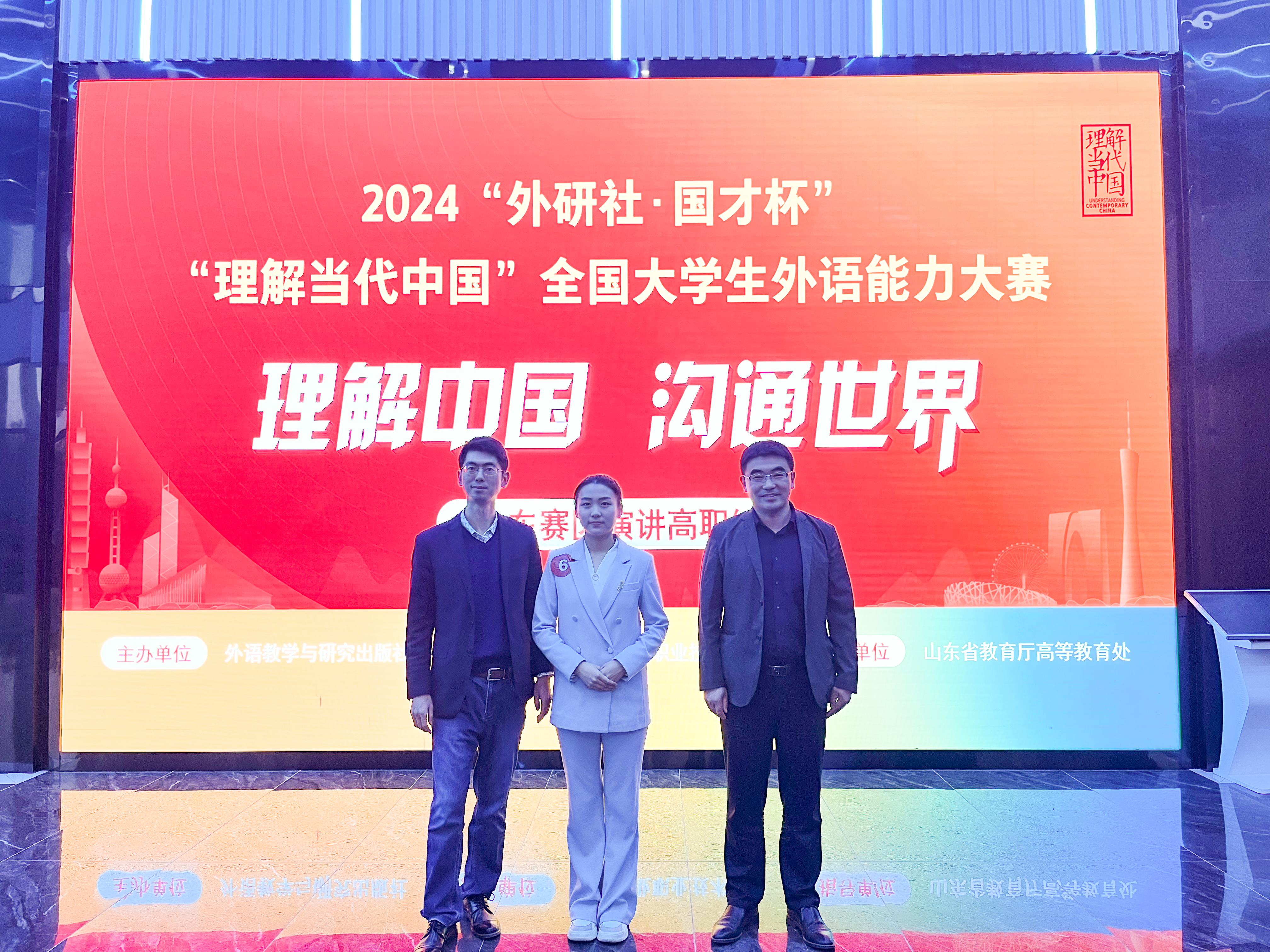 On November 2, the Shandong Provincial Finals (Higher Vocational Group) of the 2024 "FLTRP · ETIC Cup" "Understanding Contemporary China" National College Students' Foreign Language Proficiency Speech Contest was held in Jinan, attracting over one hundred contestants from various vocational colleges across the province. The competition was exceptionally fierce, and Zhang Yana, a student majoring in Applied English at the School of Culture and Tourism of our university, stood out from numerous contestants and won the Gold Award under the meticulous guidance of her instructor, Song Xin.