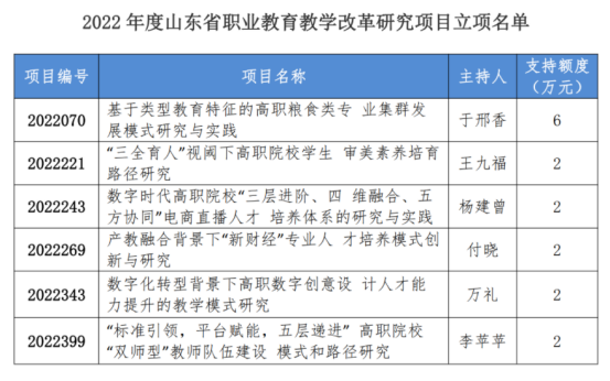 Recently, Shandong Provincial Department of Education released the "Notice on the Announcement of 2022 Shandong Province Vocational Education Teaching Reform Research Projects", and 6 of the 7 projects recommended by our school were awarded, including 1 key project and 5 general projects, ranking 8th in the province's higher vocational institutions, with approved funding of 160,000 yuan.