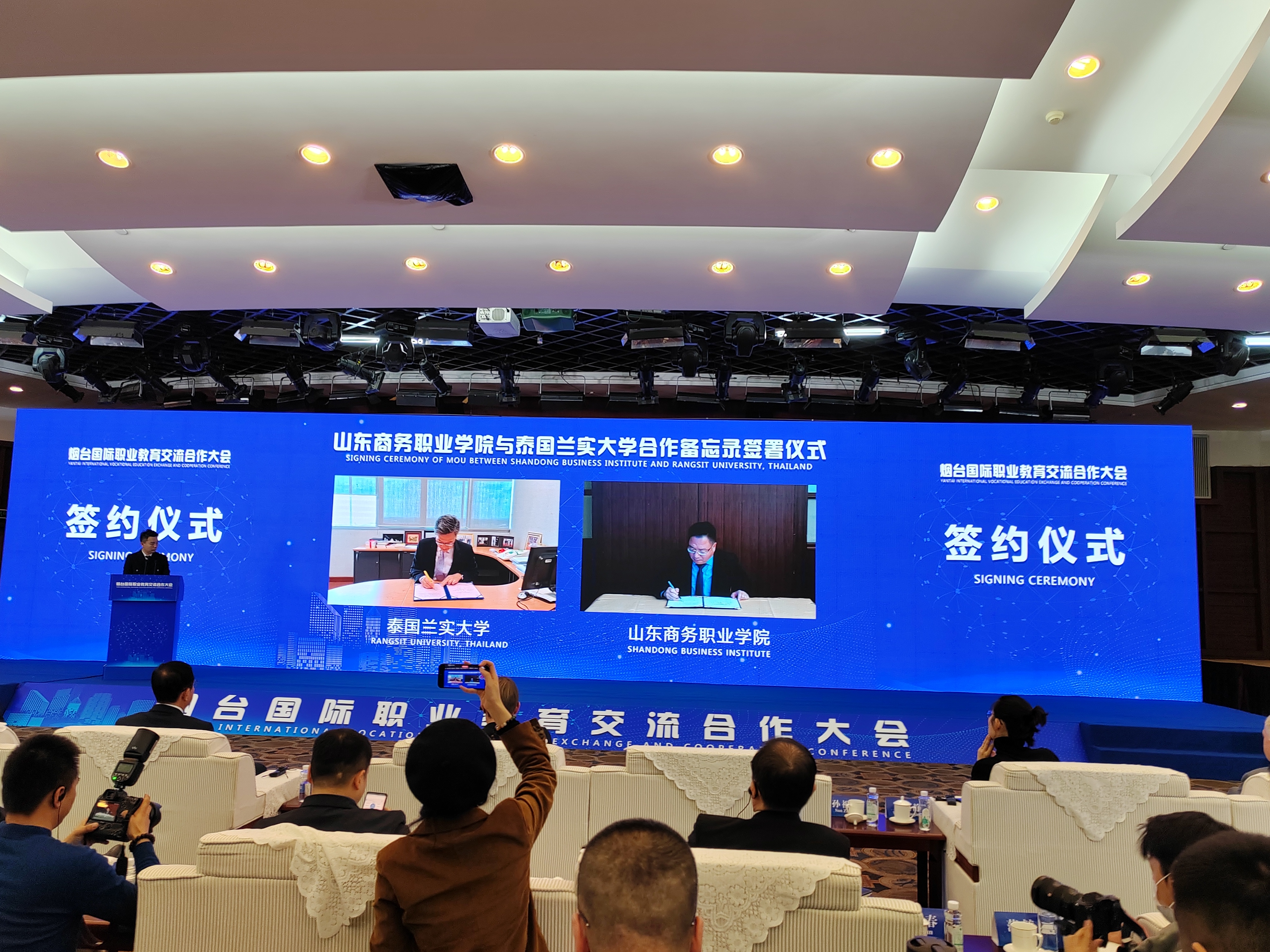 Recently, the Yantai International Vocational Education Exchange and Cooperation Conference was held at the Dongfang Haotian Hotel. During the conference, ,Shandong Business Institute signed a cooperation agreement with Thailand's Rangsit University to build an "International Joint Laboratory" and a strategic cooperation agreement with the College of Technology in Laos.